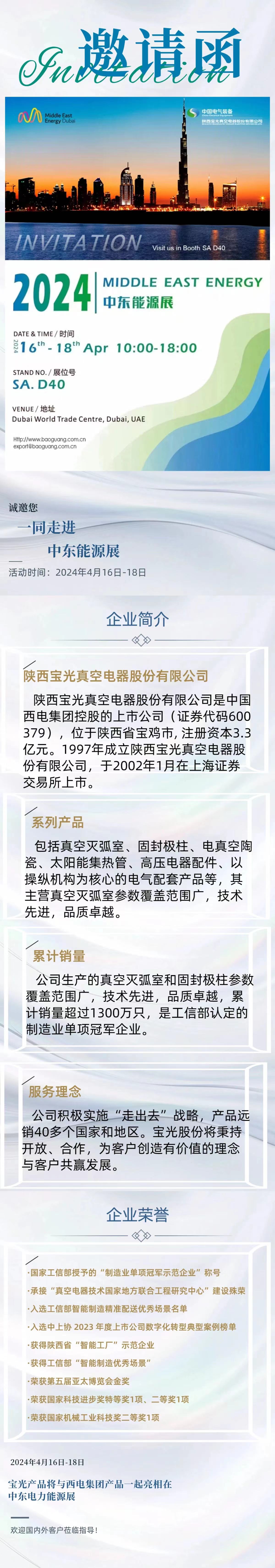 陕西伟德体育官方网站将携真空灭弧室最新产品亮相中东能源展中国西电集团展位(展位号SA. D40)