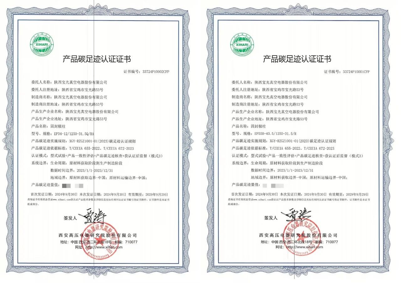 Recently, some of Shaanxi Baoguang's vacuum interrupters and embedded poles have successfully obtained carbon footprint certification. This certificate certifies the greenhouse gas emissions of the product throughout its entire lifecycle (from raw material collection, production, distribution, application to final disposal). It will serve as a "green passport" for our company to expand overseas markets.