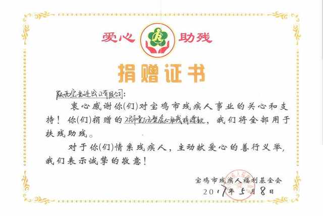 获悉该信息后,伟德体育官方网站进出口公司提出了向“宝鸡市残疾人福利基金会”捐款的申请,此举得到了股份公司领导的大力支持。