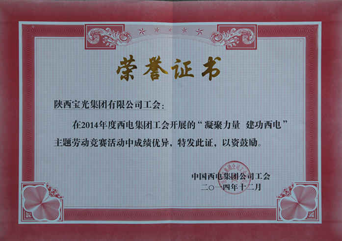近日获悉,在西电集团召开的“凝聚力量、建功西电”2014年度劳动竞赛活动先进评选中,我公司工会等10个单位获得西电集团工会“凝聚力量 建功西电”2014年度劳动竞赛活动优秀单位,西电集团工会为我公司颁发了荣誉证书。