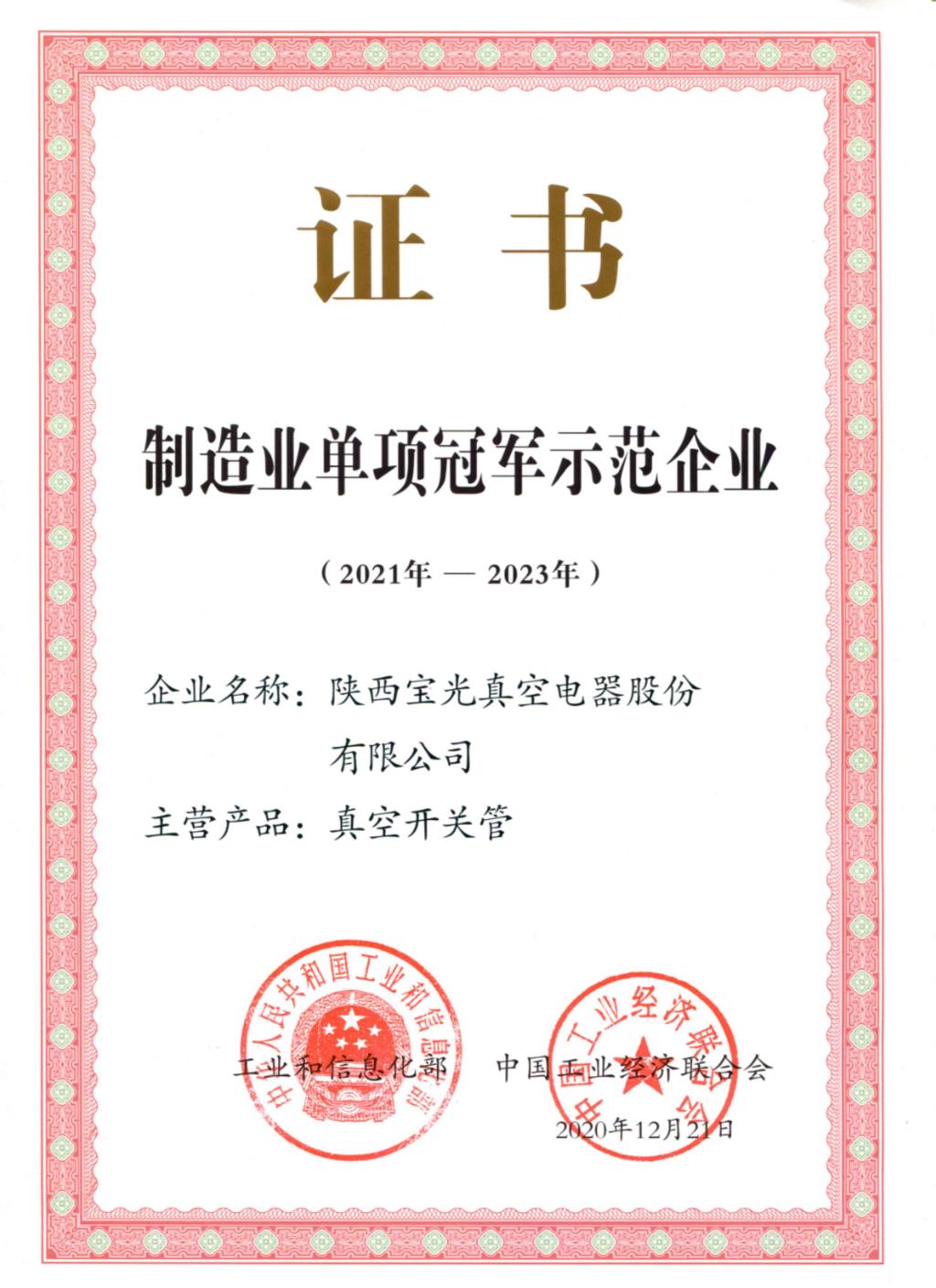 日前,陕西伟德体育官方网站真空电器股份有限公司(以下简称“伟德体育官方网站股份”)继2017年入选制造业单项冠军后,顺利通过工业和信息化部与中国工业经济联合会复核,蝉联“制造业单项冠军示范企业(2021-2023)”。