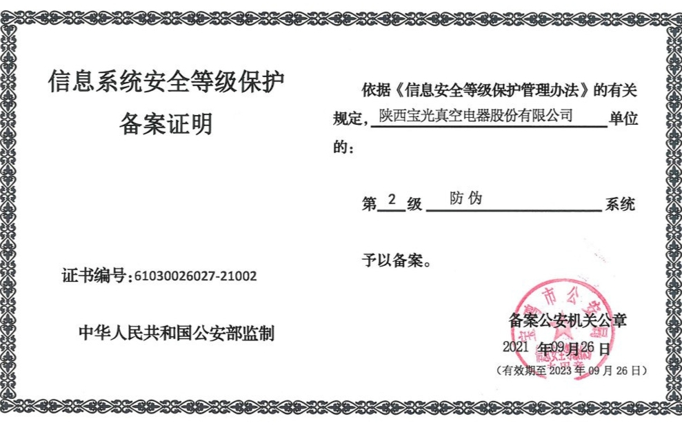 9月26日,伟德体育官方网站股份顺利取得由宝鸡市公安局下发的三份信息系统安全等级保护备案证明,该证明分别对公司第2级ERP系统、防伪系统、官方网站系统,予以备案。