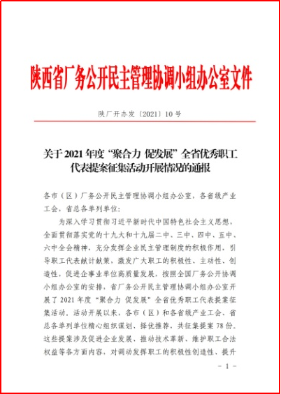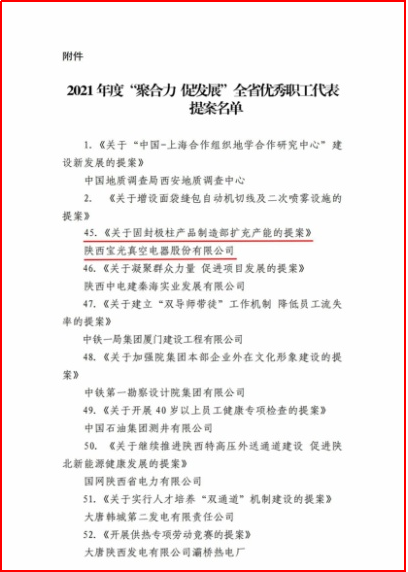 近日,从陕西省总工会传来喜讯,伟德体育官方网站集团《关于固封极柱产品制造部扩充产能的提案》荣获陕西省2021年度“聚合力 促发展”全省优秀职工代表提案。