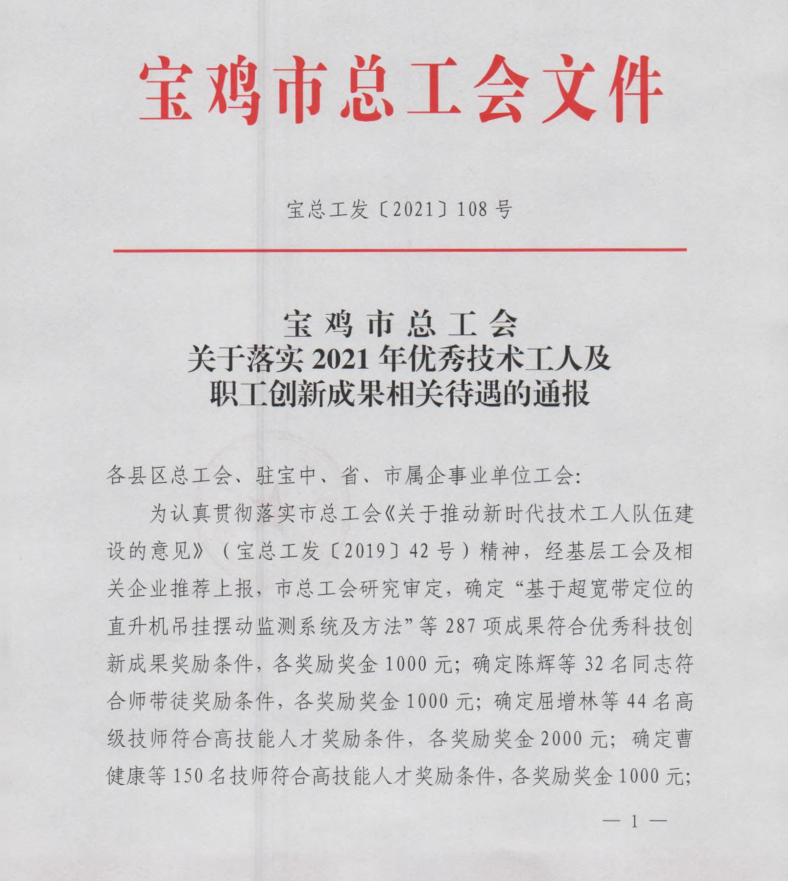 近日,从宝鸡市总工会传来喜讯,伟德体育官方网站股份9项职工科技创新成果荣获“宝鸡市优秀科技创新成果奖”。