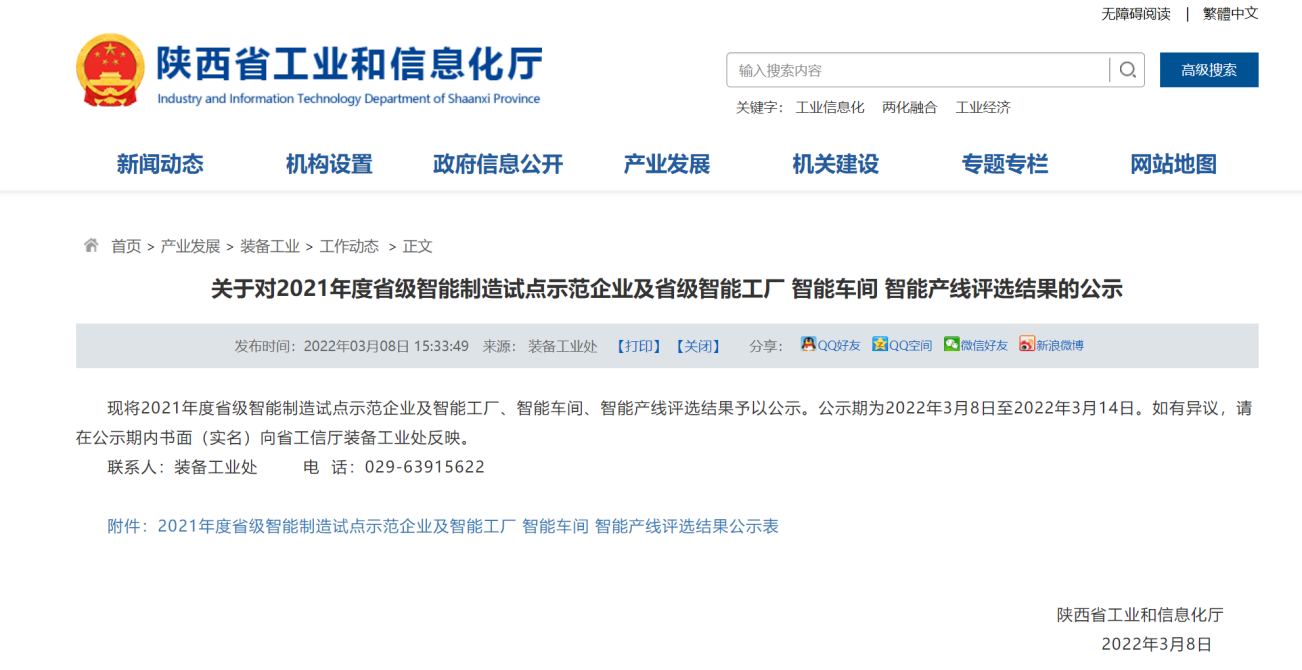 3月14日,陕西省工信厅装备工业处发布2021年度省级智能制造试点示范企业及省级智能工厂名单,伟德体育官方网站股份获评“2021年度省级智能工厂”。
