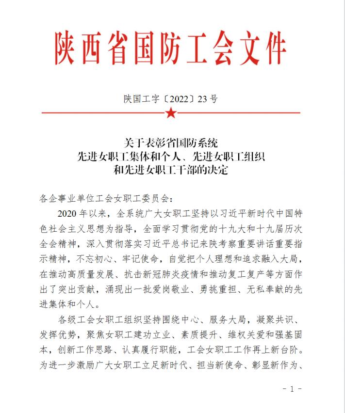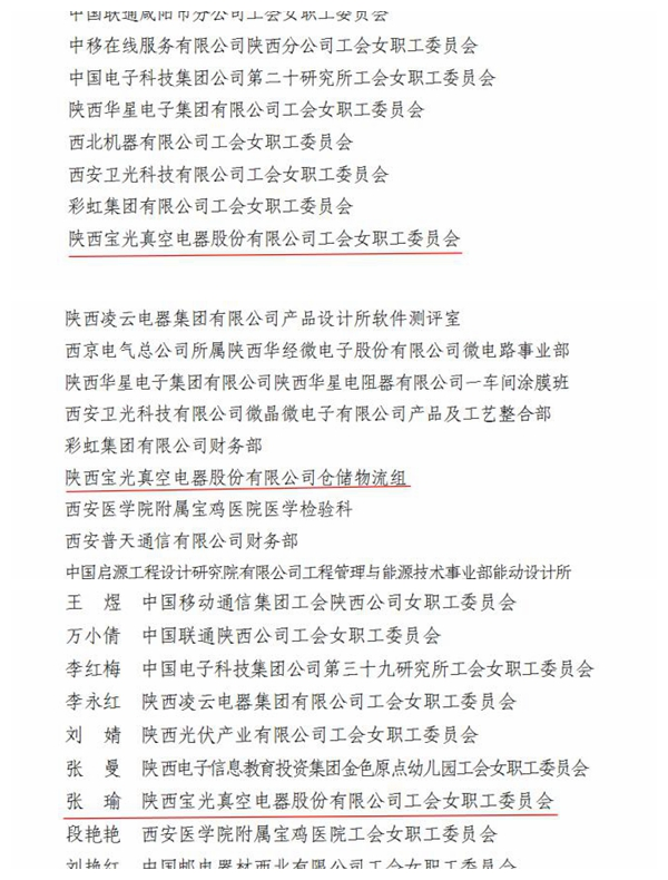 近日,从陕西省国防工会传来喜讯,陕西伟德体育官方网站真空电器股份有限公司工会委员会女职工委员会被授予“陕西省国防工会先进女职工委员会”荣誉称号,生产管理处仓储物流组被授予“陕西省国防科技工业五一巾帼标兵岗”,工会办公室张瑜同志被评为“陕西省国防工会先进女职工干部”荣誉称号。
