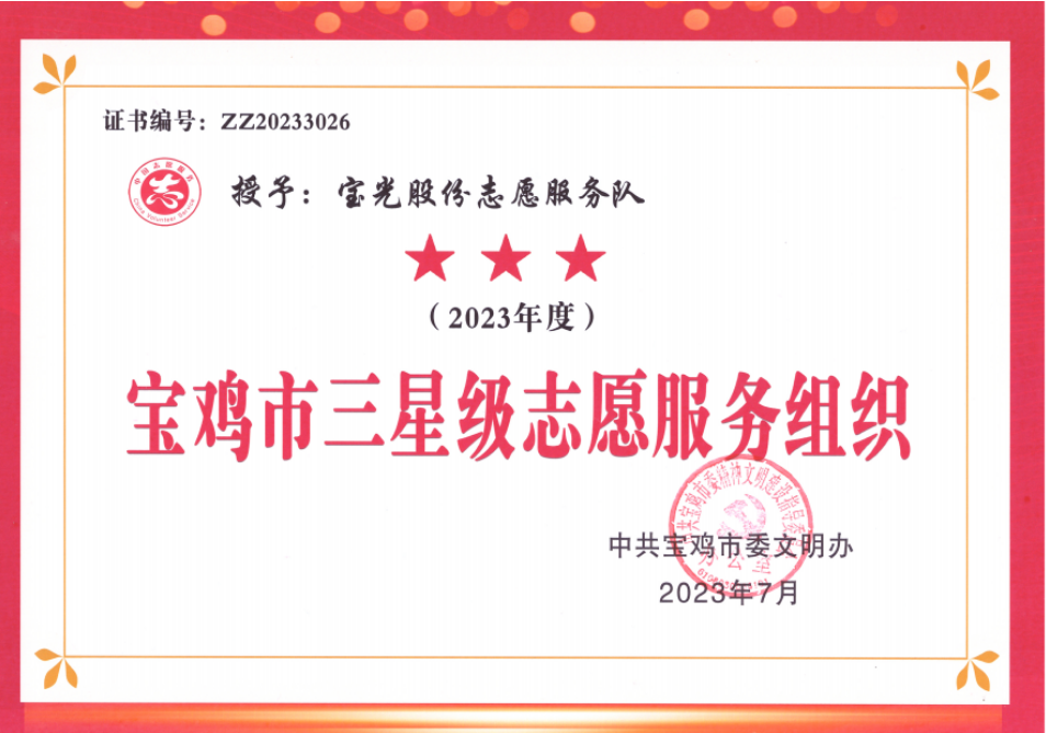 日前,伟德体育官方网站股份志愿服务队被中共宝鸡市委文明办评为“宝鸡市三星级志愿服务组织”。