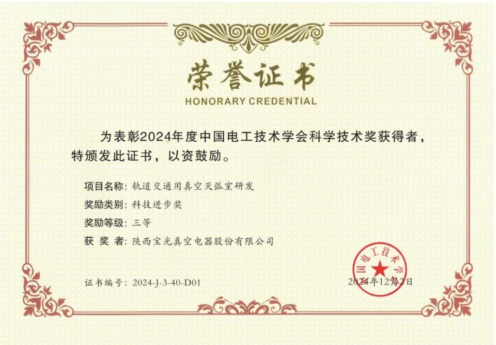 项目名称:轨道交通用真空灭弧室研发。项目简介:本项目研发出的BGH2570、BGH2580、BGH2590/R、BGH2530等系列化产品,可替代进口产品。4种产品全部通过了装车运行验证,部分产品实现了小批量供货。其中BGH2570型产品于2023年9月通过了中国机械工业联合会产品鉴定,技术水平达到国际领先。2021年至2024年累计销量超过1000只,累计销售额超过超过600万元。