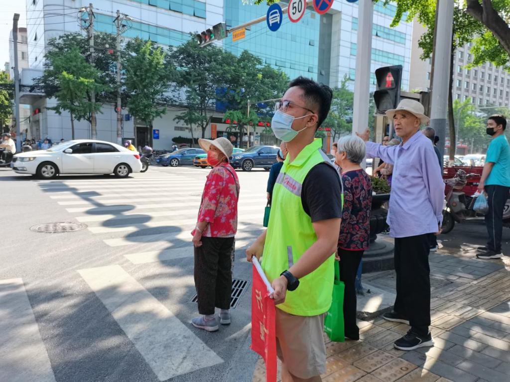 顶着炎炎烈日,志愿者身穿“黄马甲”站在峪泉路和公园路十字路口,及时对行人和非机动车横穿马路、乱闯红灯等不文明交通行为进行劝导,引导其遵章守纪、文明出行,同时还耐心热情地为需要帮助的行人指路,以实际行动传递社会正能量和新时代文明新风尚。