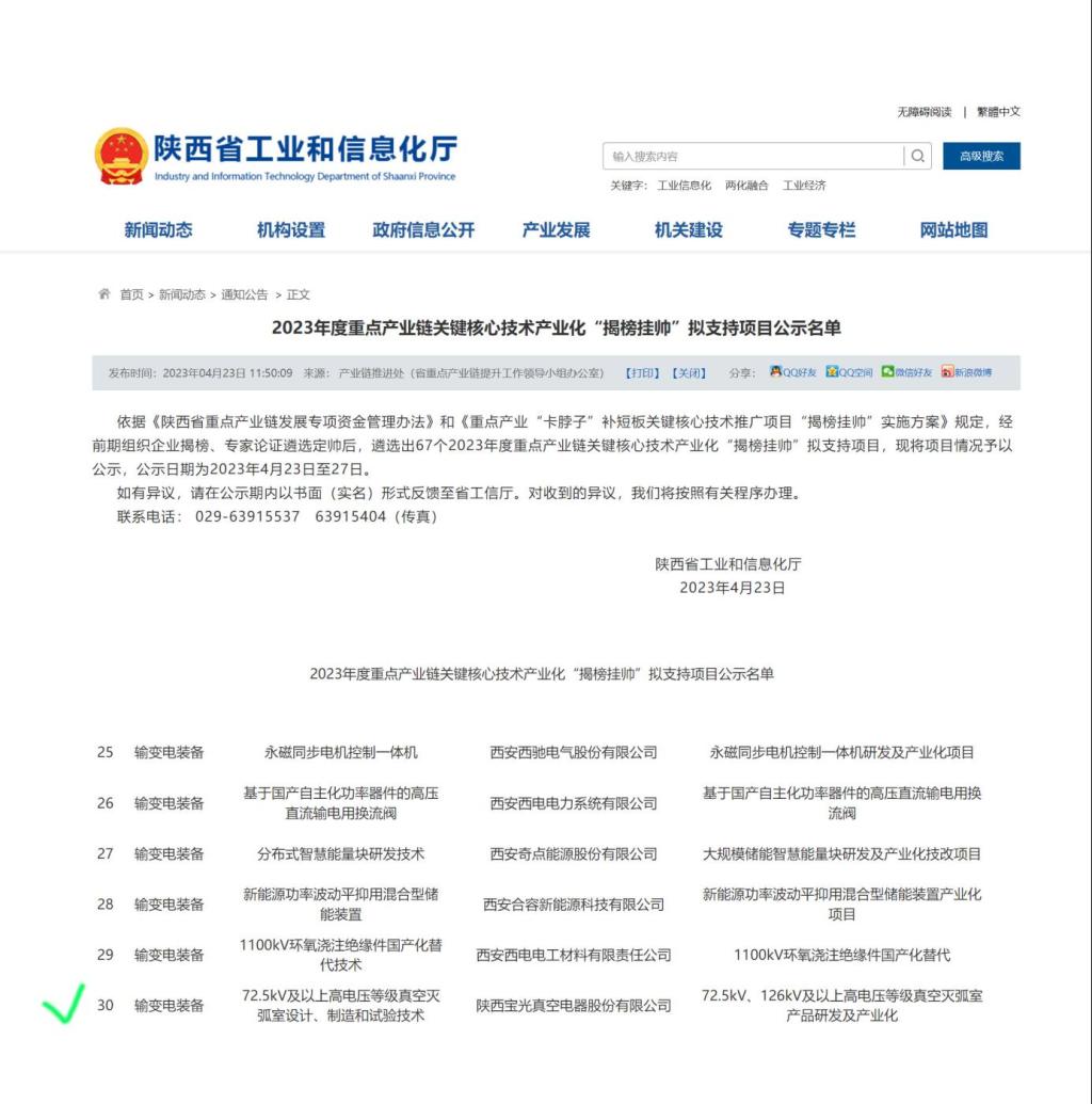 通过认真筹备、资料审核及现场答辩,由公司组织申报的“72.5kV、126kV及以上高电压等级真空灭弧室产品研发及产业化”项目与“高铁车载开关用真空灭弧室智能化产线建设”项目分别中榜陕西省工信厅2023年关键核心技术产业化“揭榜挂帅”项目与重点产业链发展项目,并已进入公示阶段。